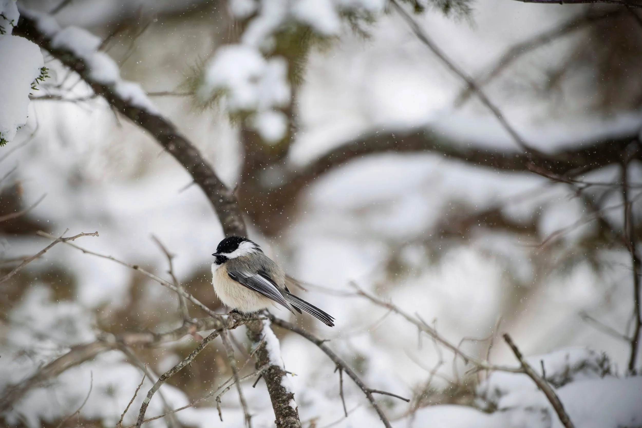 Black-capped chickadee in a winter storm